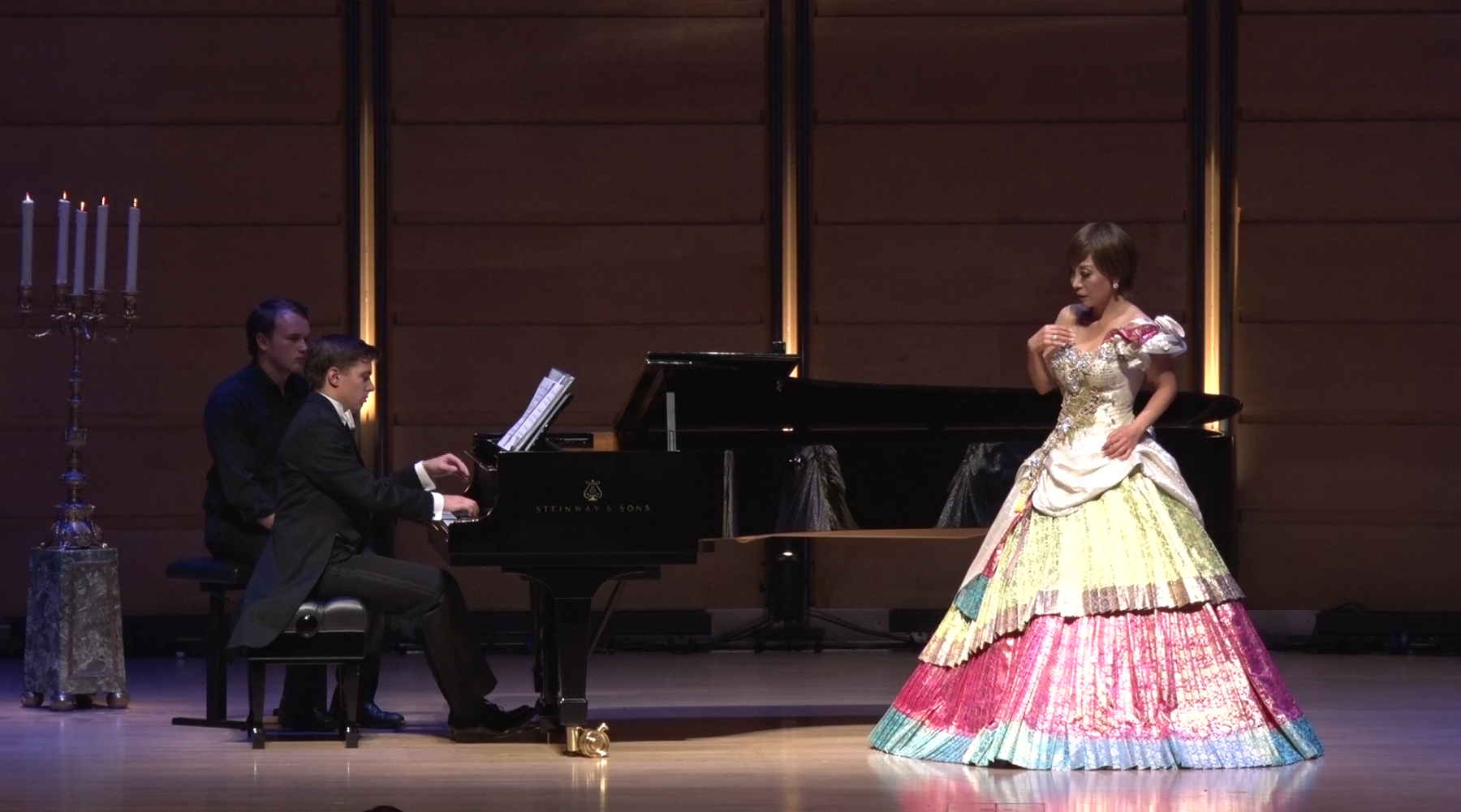 This a good example of mixing styles – of the Korean meeting the European – it is a mélange of traditions. It is produced in Korean silk, and you can see the gold, shiny pink, and green are made from this special textile that is usually reserved for traditional Korean costume. But here they have been used to make a Western-style dress. It is a marriage between the two worlds, and was the first time I had used traditional textiles with a very westernised evening gown. On the right side of the dresss you can see a special Korean accessory. This accessory was once only made for members of the royal family, for princesses and queens. It belongs to the very highest level of society, and I feel honoured to wear it. It feels to me to be very feminine with the off-shoulder design, but it has many layers, 3 underskirts, and weighs 23 kilos.